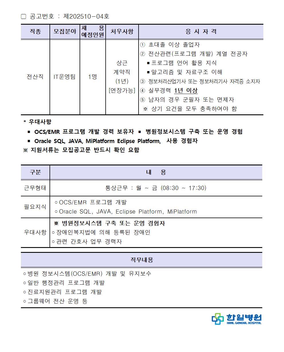 | 채용공고명 | [ 온라인 ] IT운영팀 전산직 직원 채용 | ||||