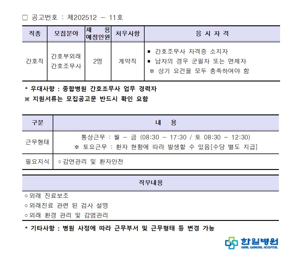 | 채용공고명 | [ 온라인 ] 간호부 외래 간호조무사 채용 | ||||