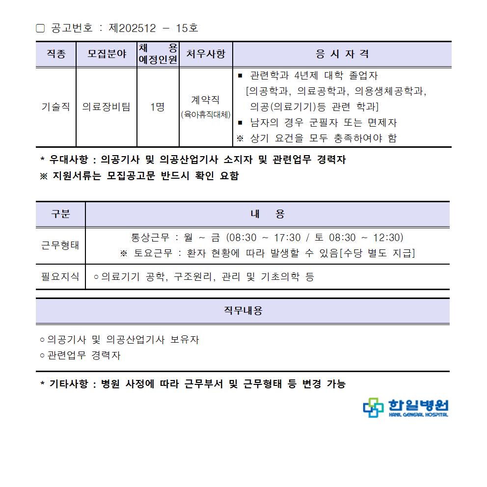 | 채용공고명 | [ 온라인 ] 의료장비팀 기술직 채용 | ||||