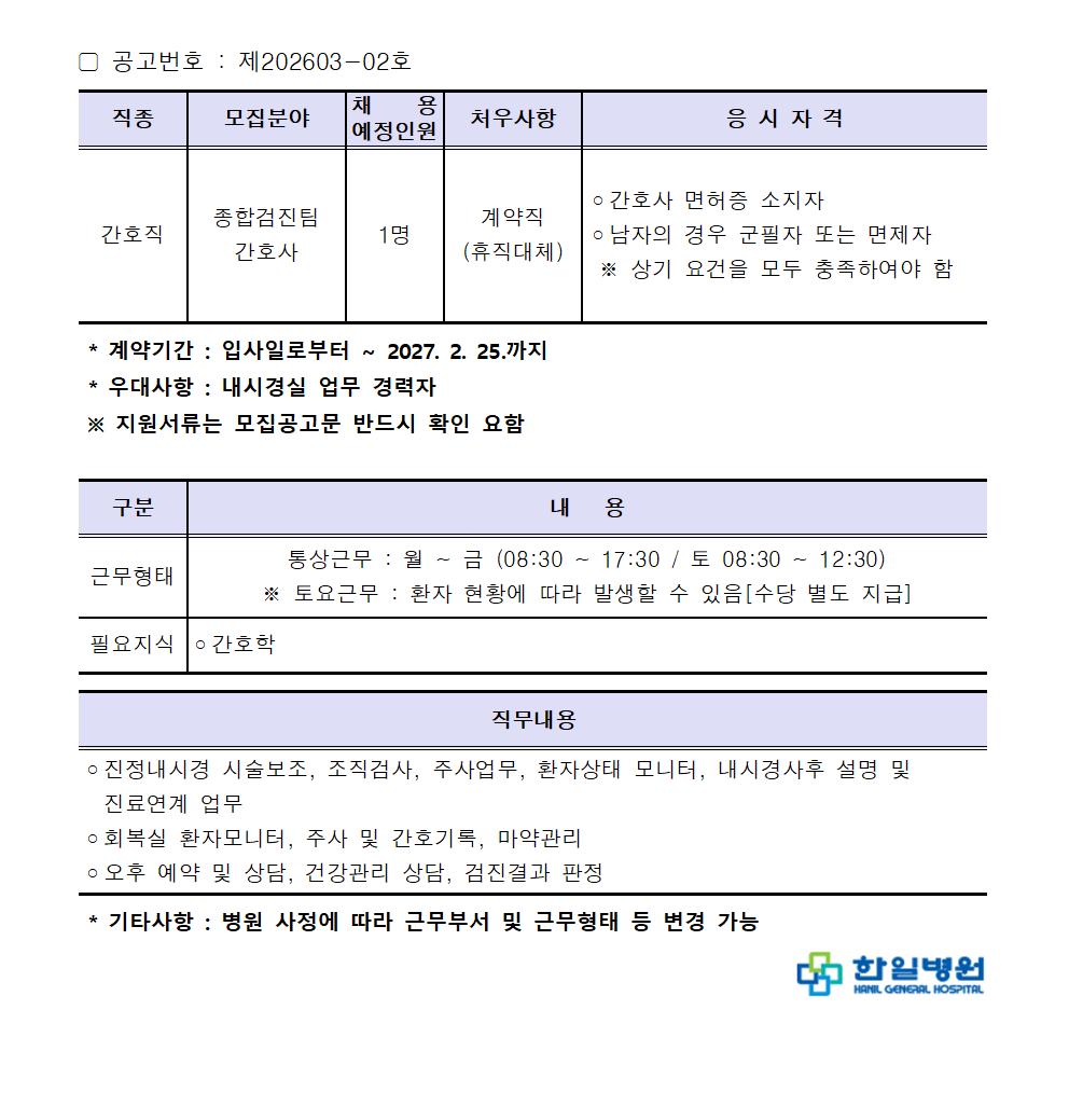 | 채용공고명 | [ 온라인 ] 건강증진센터 종합검진팀 간호사(휴직대체) 모집 | ||||